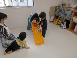 子ども達に何して遊びたいか聞いて、ぬいぐるみやすべり台、絵本コーナーも