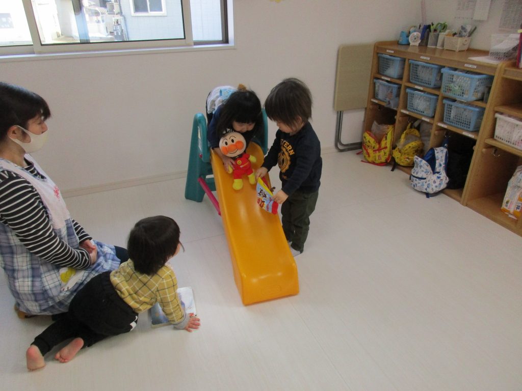 「すべる時はぬいぐるみは置いてからね」とお話しすると