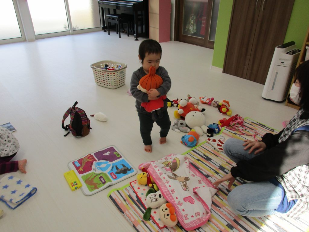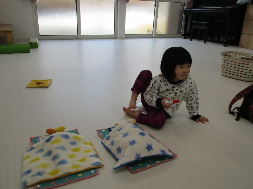 ぬいぐるみをお布団に寝かせ付けたり、バックにたくさん詰め込んでいた