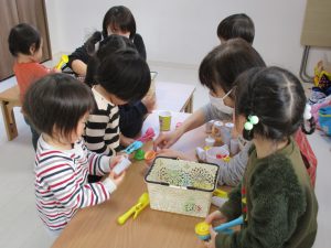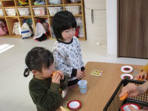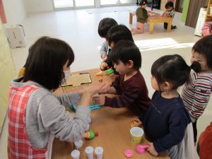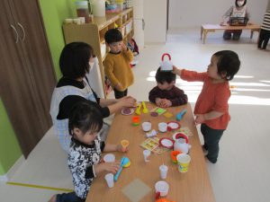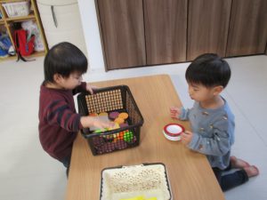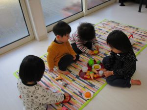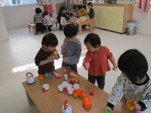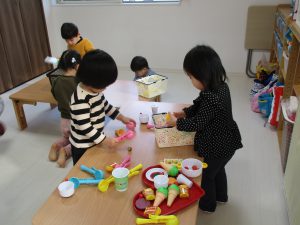 0歳児さんは玩具遊び、1・2歳児さんはハンバーガー屋さん・