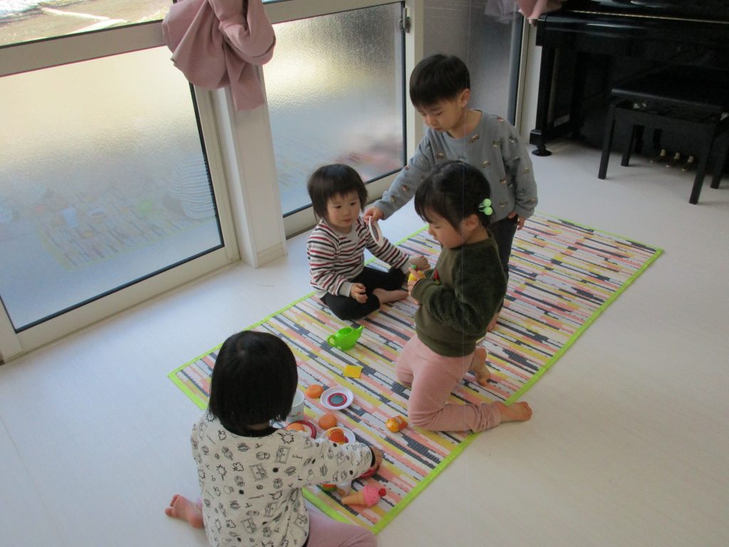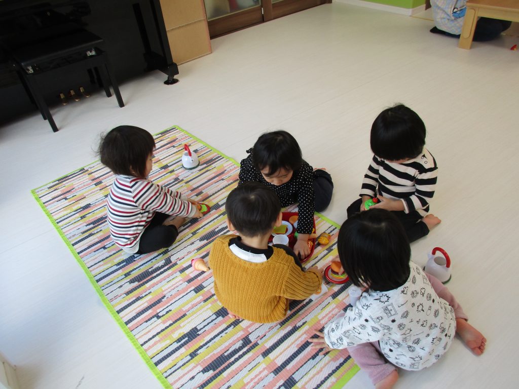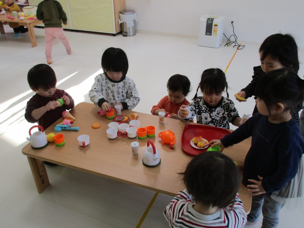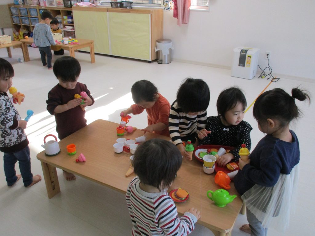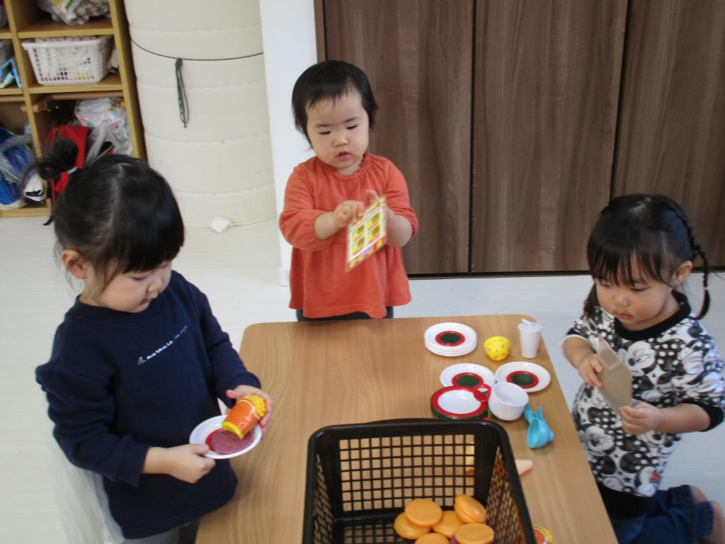 0歳児さんは玩具遊び、1・2歳児さんはハンバーガー屋さん・