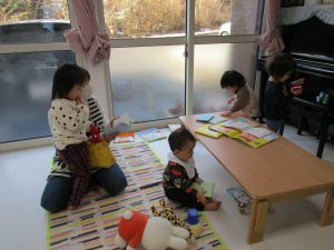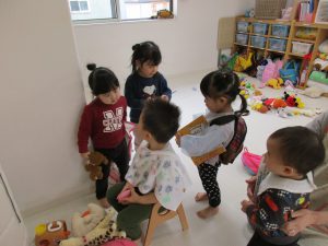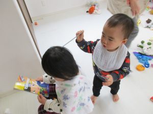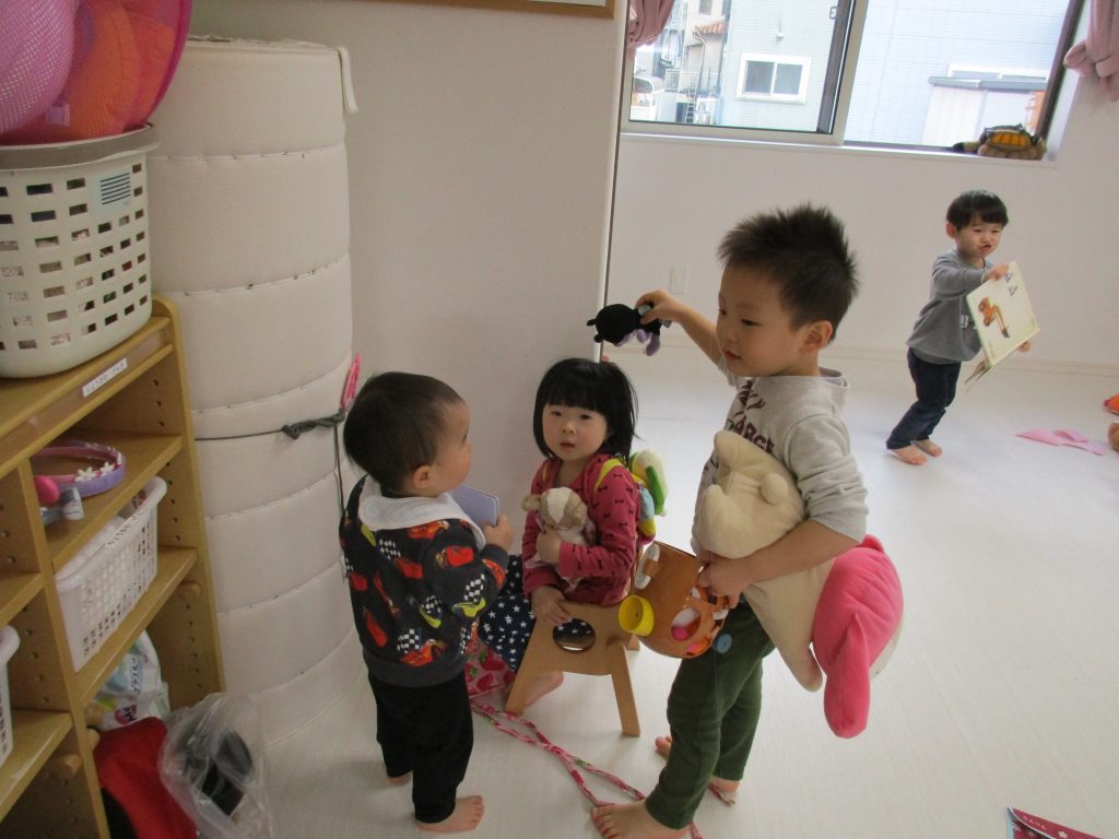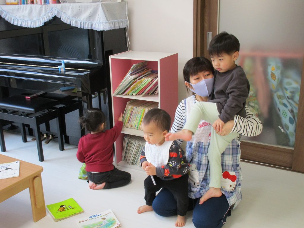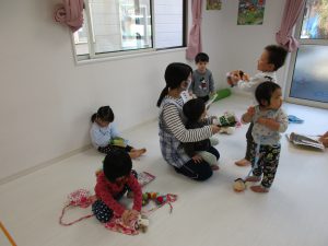 今日は0歳児さんの大きいお友達は1・2歳児さんのお部屋で一緒に
