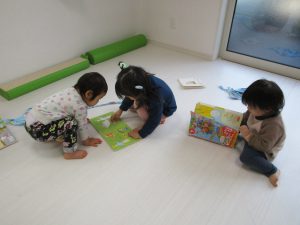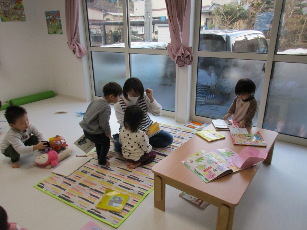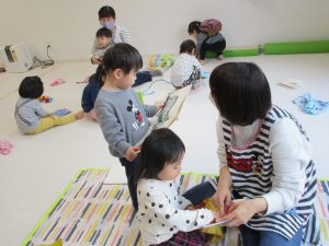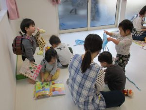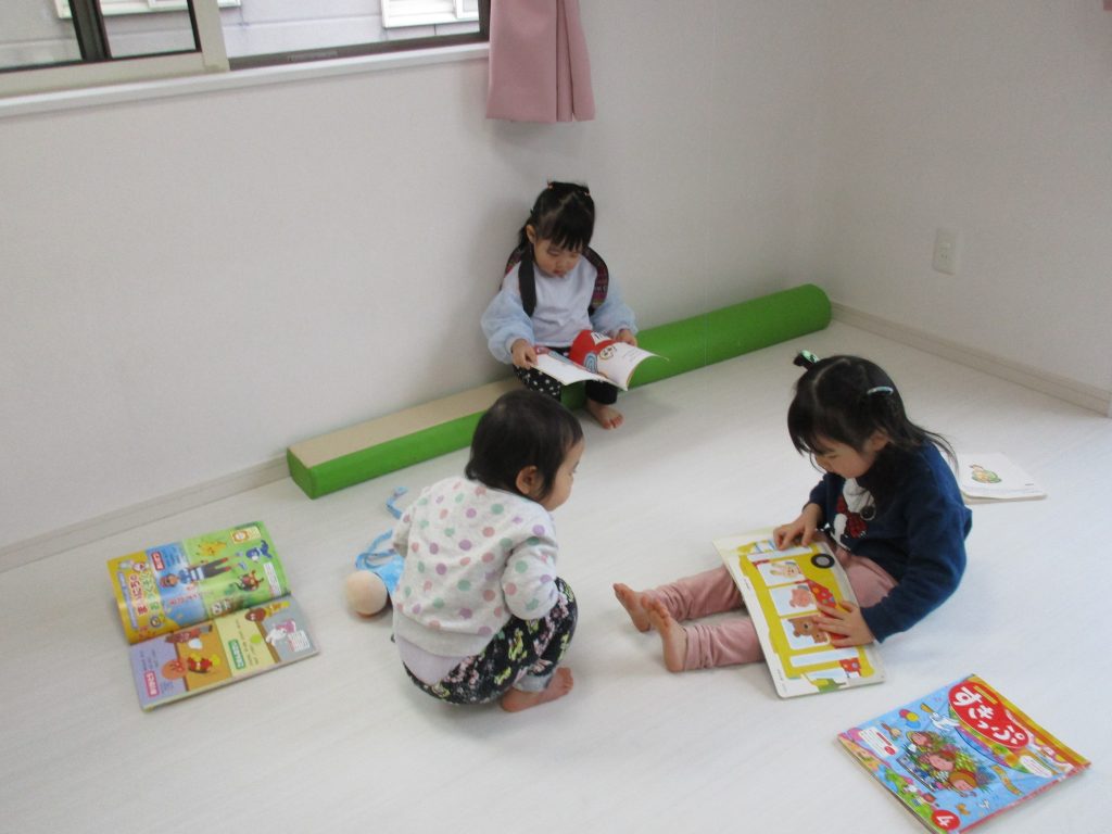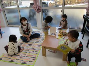 好きな本を選んできて先生と一緒に見たり、お友達と一緒にみたり