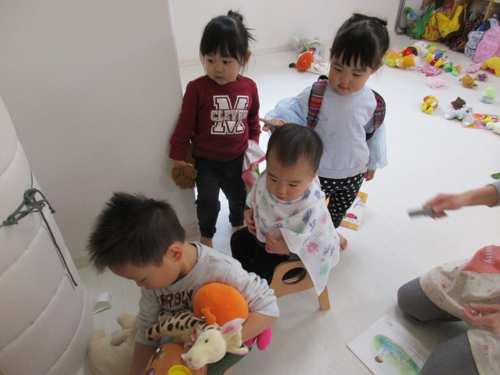 0歳児のお友達も床屋さんごっこに興味を持ち、お兄さん、お姉さん達の