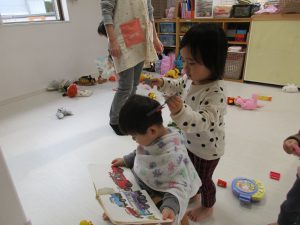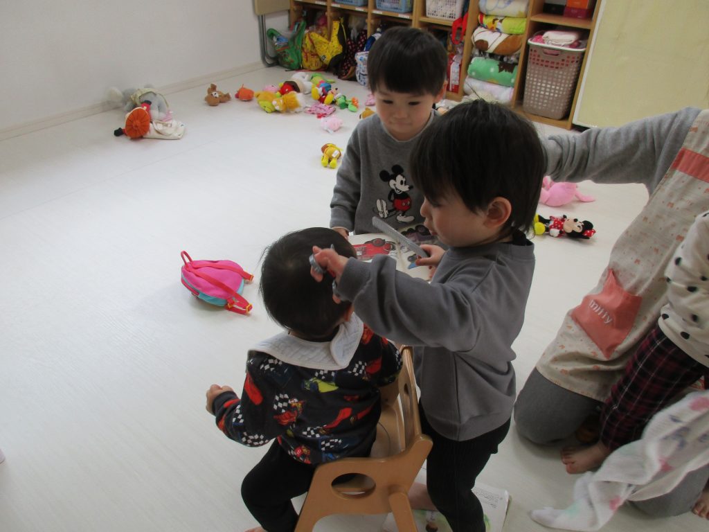 床屋さんごっこが始まり、お友達が集まってきました(^o^)
