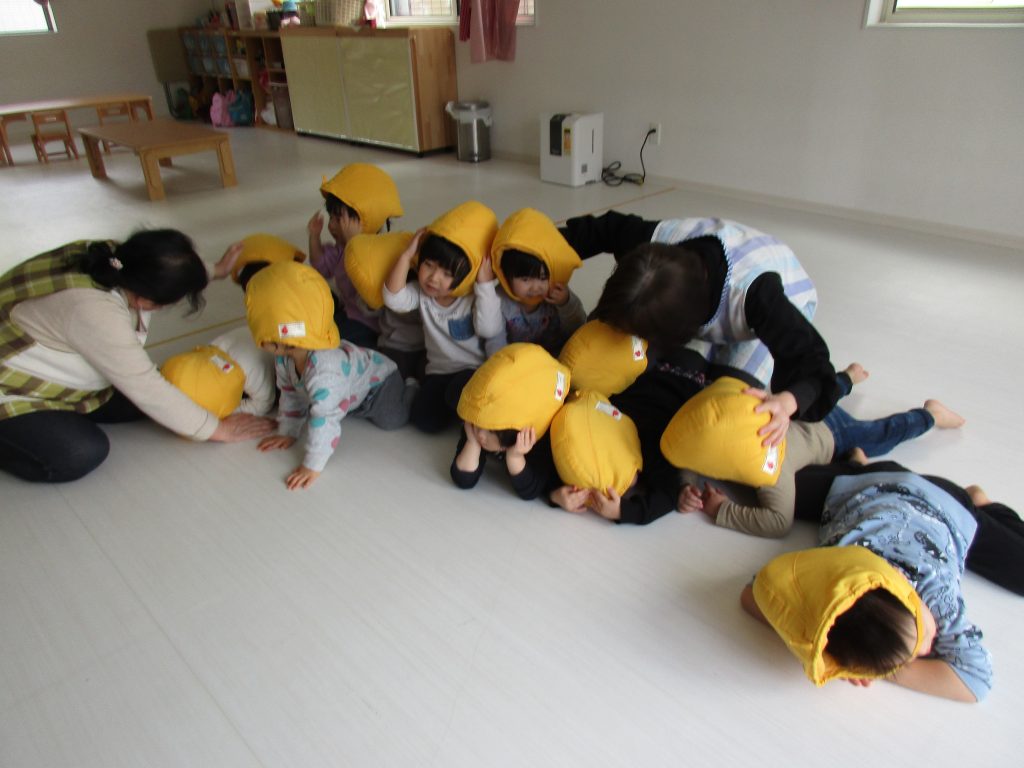 サイレンが鳴って防災頭巾を被り、みんなでダンゴムシのポーズをしました(^_^)