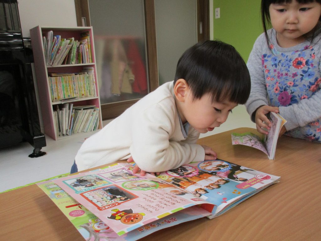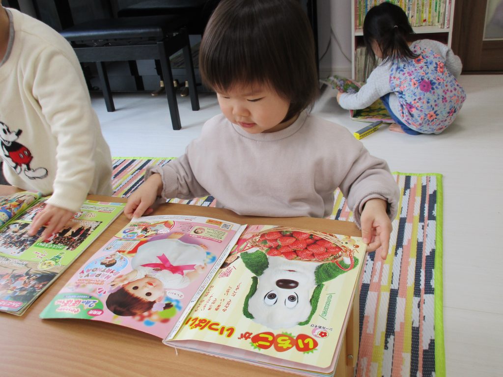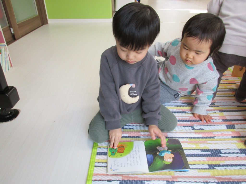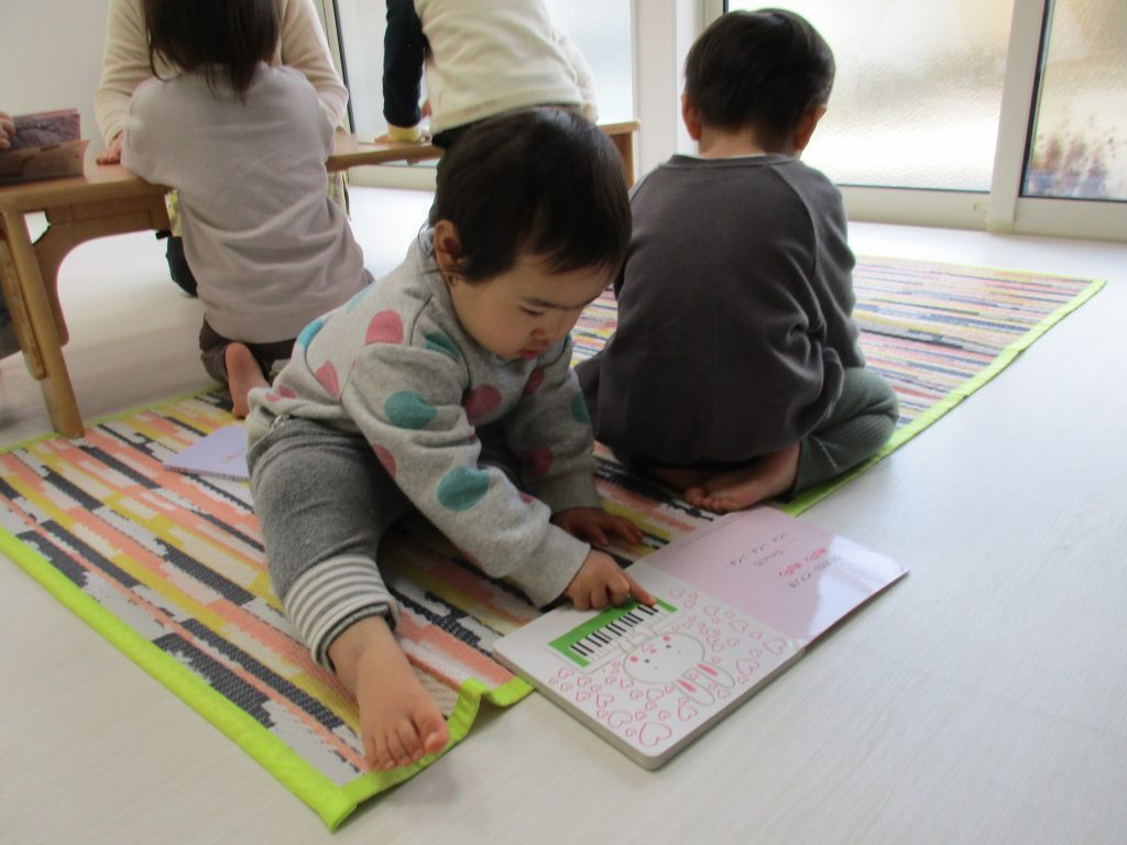 製作、1歳児さんは色々な玩具で遊んだり絵本を見たりしました(^_^)