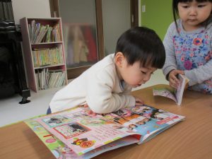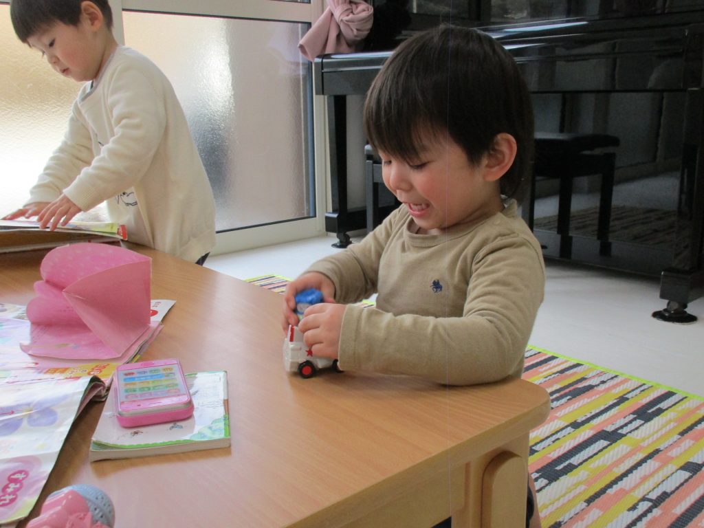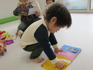 避難訓練の後は1歳児さんは色々な玩具、絵本をコーナー別に設定して