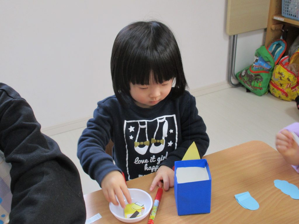 1歳児さんは明日「豆入れ」の製作をする予定です(*^_^*)