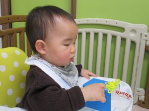 0歳児さんも「豆入れ」の製作をしました!!