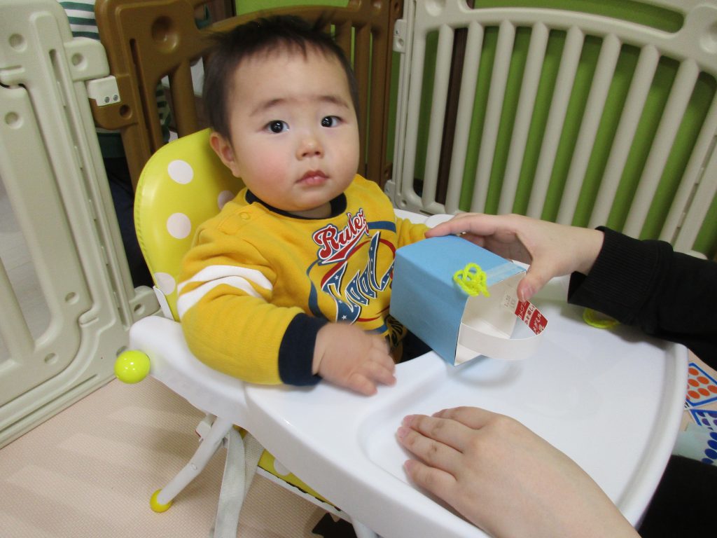 避難訓練の後は0歳児さんと2歳児さんは節分に向けて「豆入れ」の