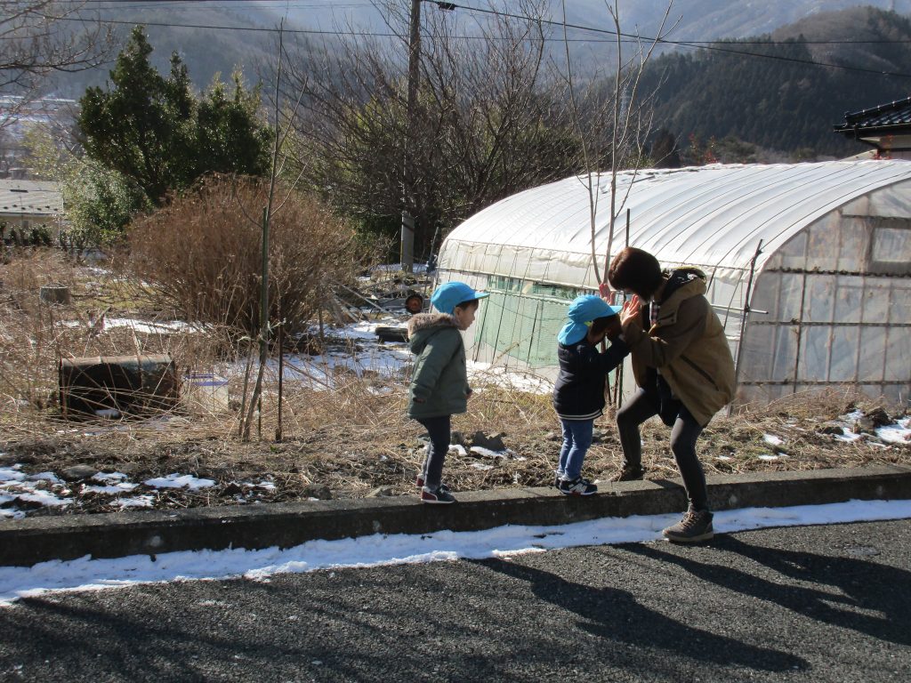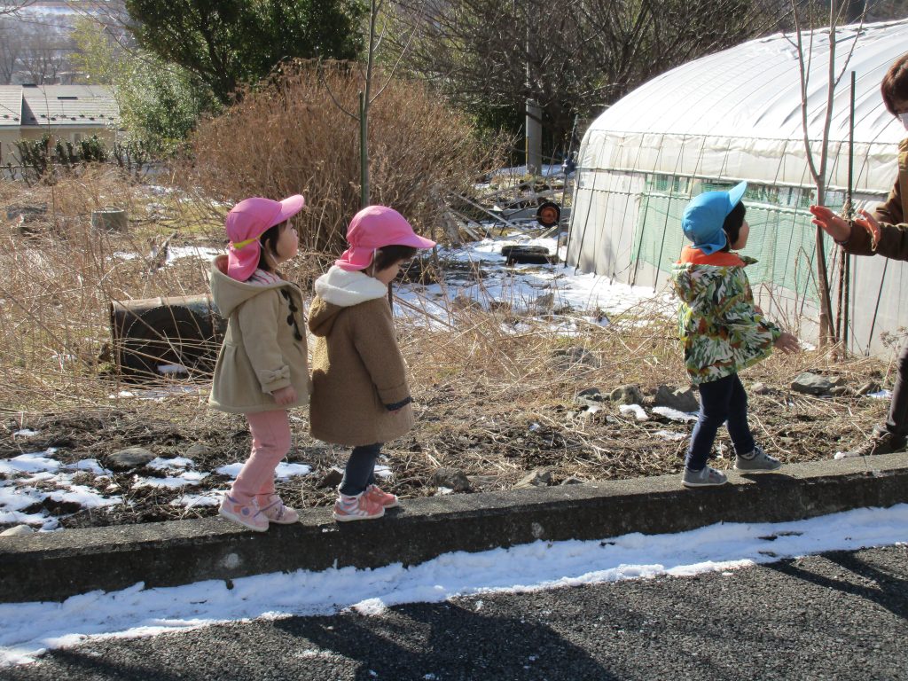 おやつの後は広い空間を走り回ったり、縁石の上をバランスを取りながら