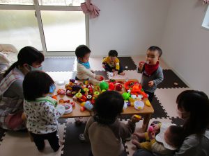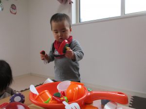 0歳児さんはままごと遊び、1・2歳児さんはアンパンマンブロックや