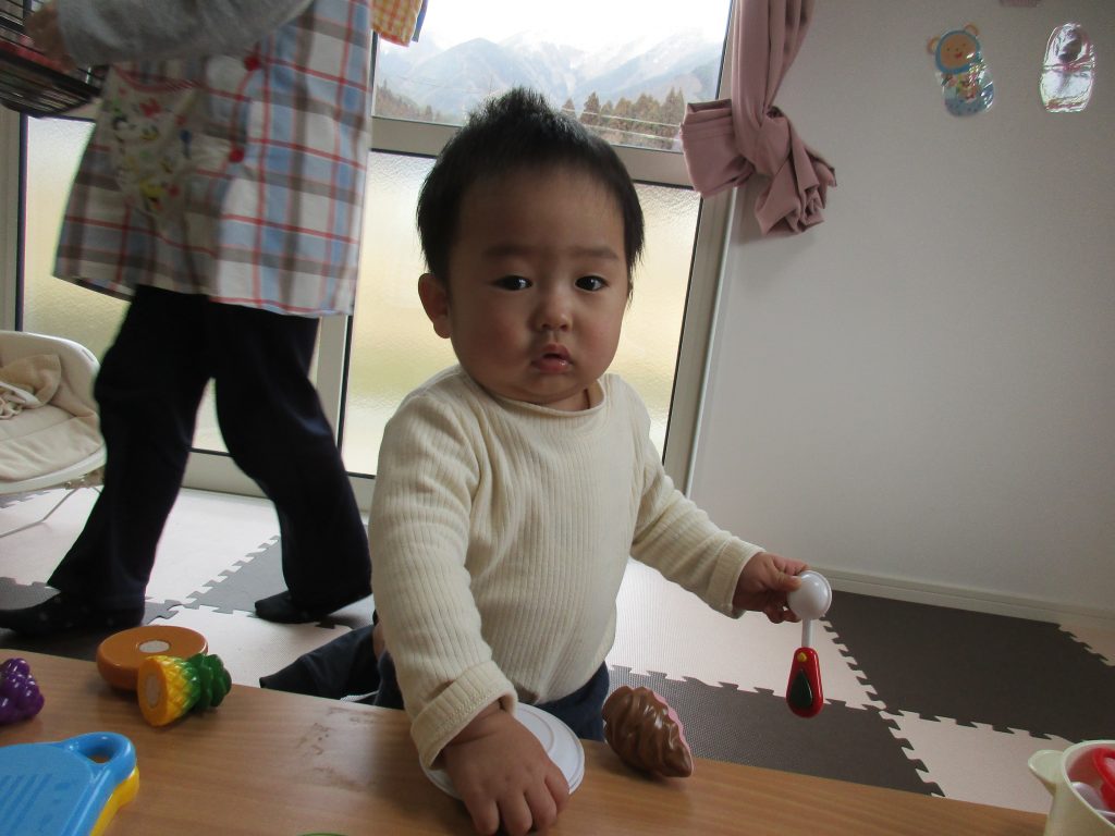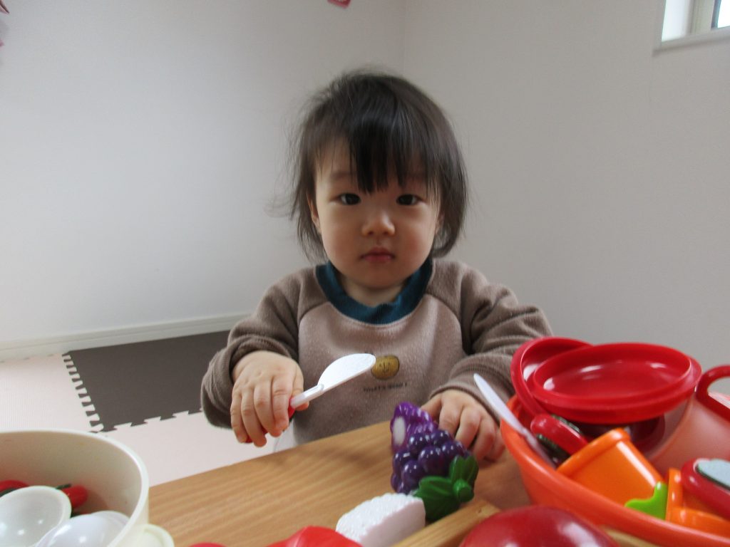 テーブルを出してその上にままごとを並べて遊びました(*^_^*)