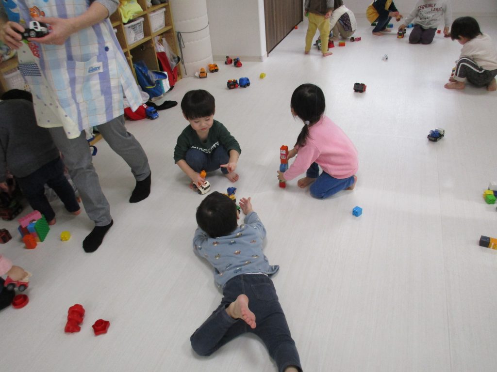 ブロックを組み立てたり、車を走らせたり、お友達と関わりながら