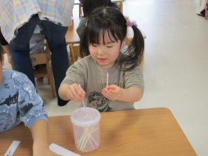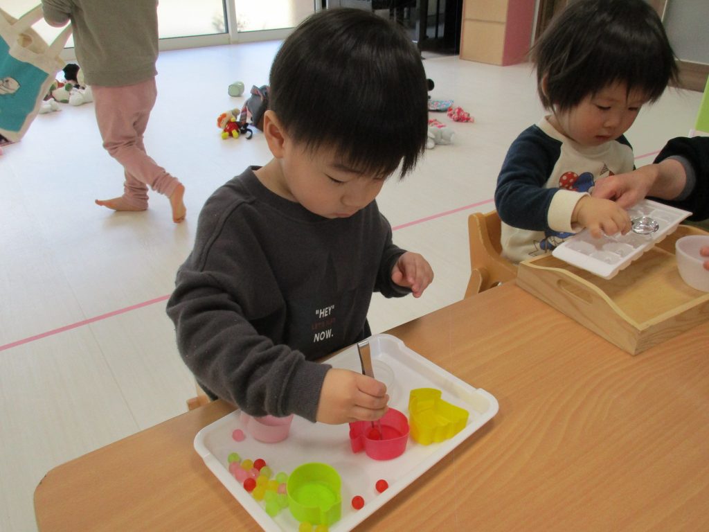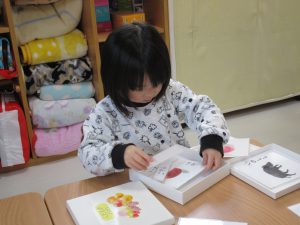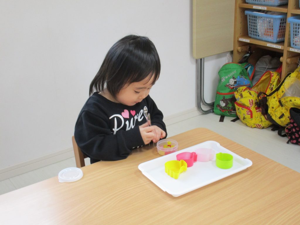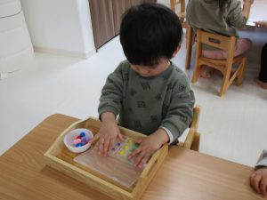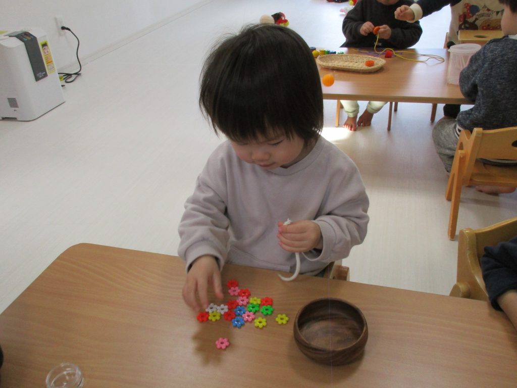 1歳児さんもピンセットを使ったり、紐通しなど細かい作業も