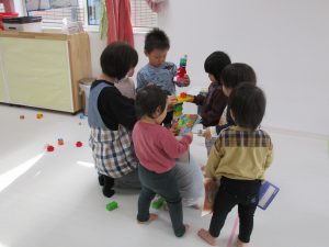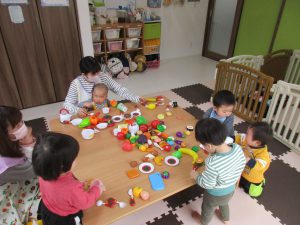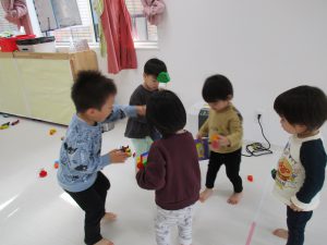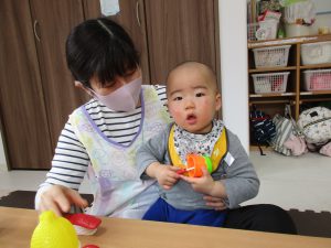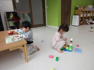 0歳児さんはままごと遊び、1・2歳児さんはアンパンマブロック・