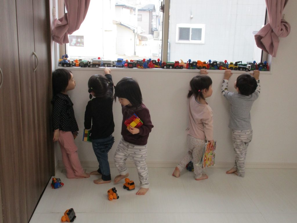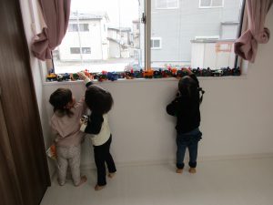 お友達と一緒に車を窓枠にたくさん並べて渋滞している道路を作ったり、