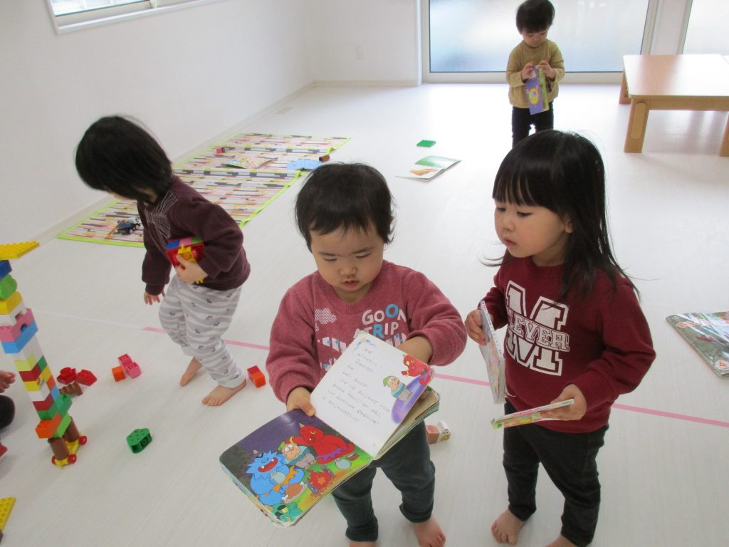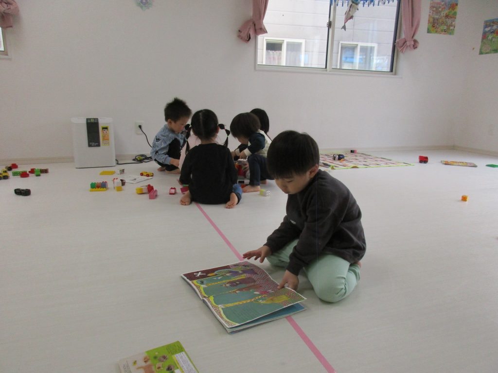 自分の好きな絵本を本棚から持ってきて集中して見ていたり、