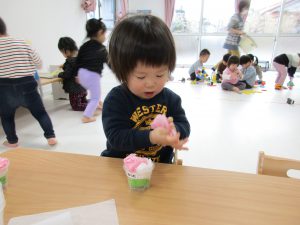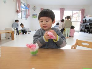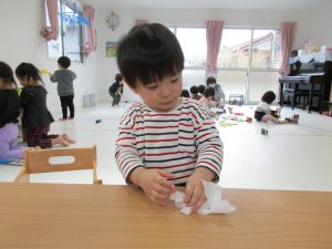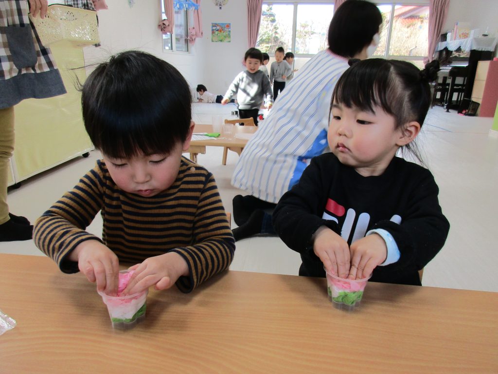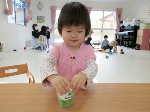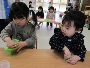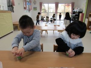 2歳児さんは力を込めてギュウギュウにぎって詰めていたり、