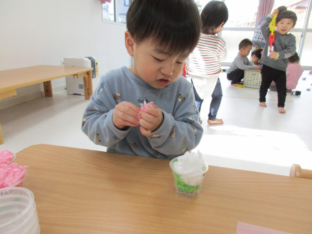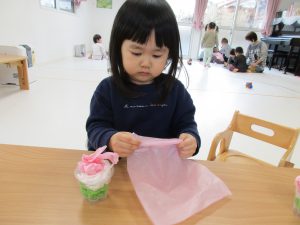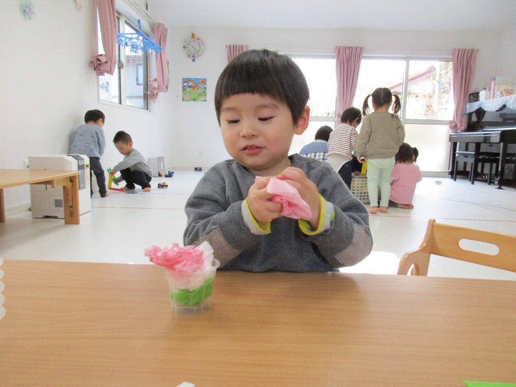 緑・白・ピンクのお花紙をくしゃくしゃに丸めて、プリンカップに