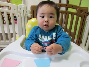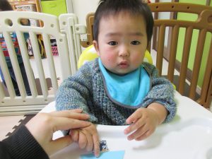 午後のおやつを食べている時に保育士と一緒にペタペタ頑張りました☺