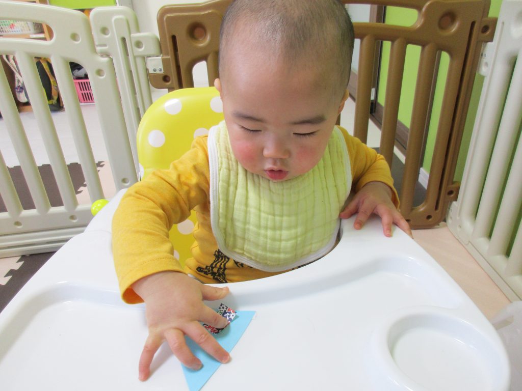 午後のおやつを食べている時に保育士と一緒にペタペタ頑張りました☺