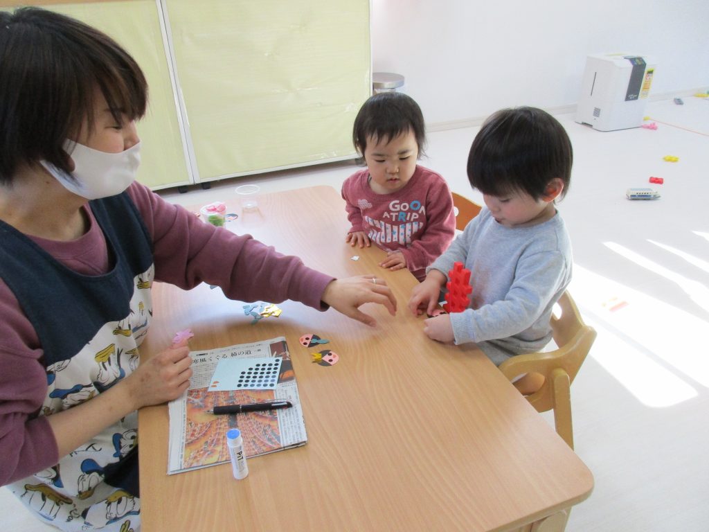1、2歳児クラスのお友だちはお内裏様とお雛様にシールで目と口を貼ったりしました🌟