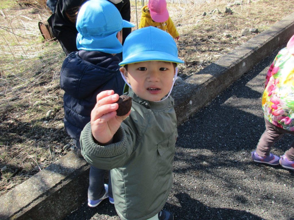 くるみや梅の種(?)  を見付けて喜びカメラ目線で見せてくる