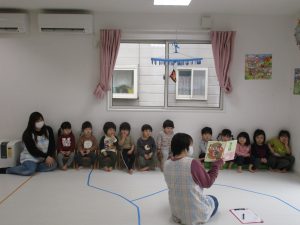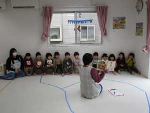 絵本の読み聞かせ中、みんな落ち着いて集中して見ていたので