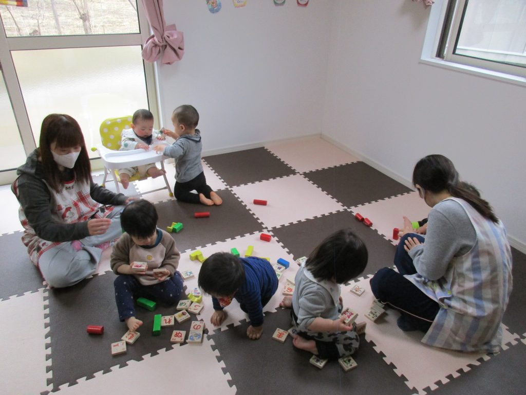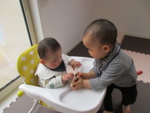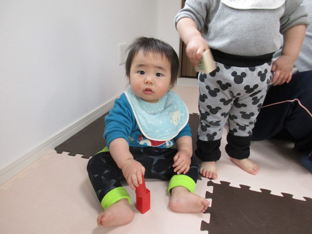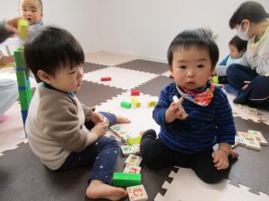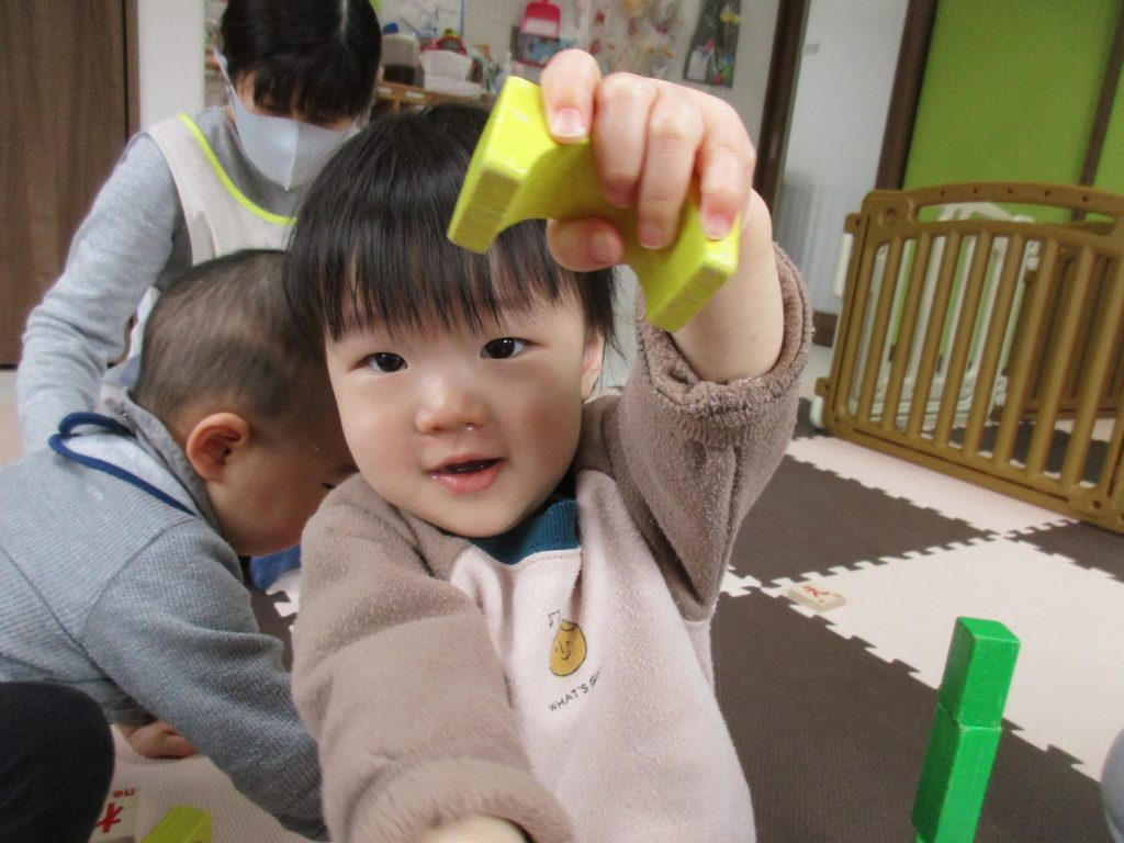 小さい赤ちゃんに積木を貸してあげていたお友達もいましたよ( ´∀`)
