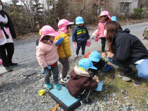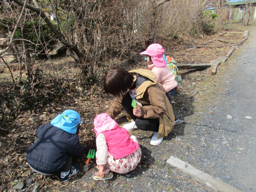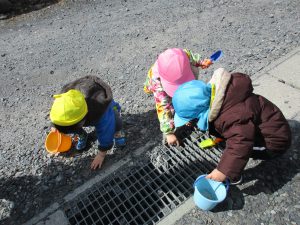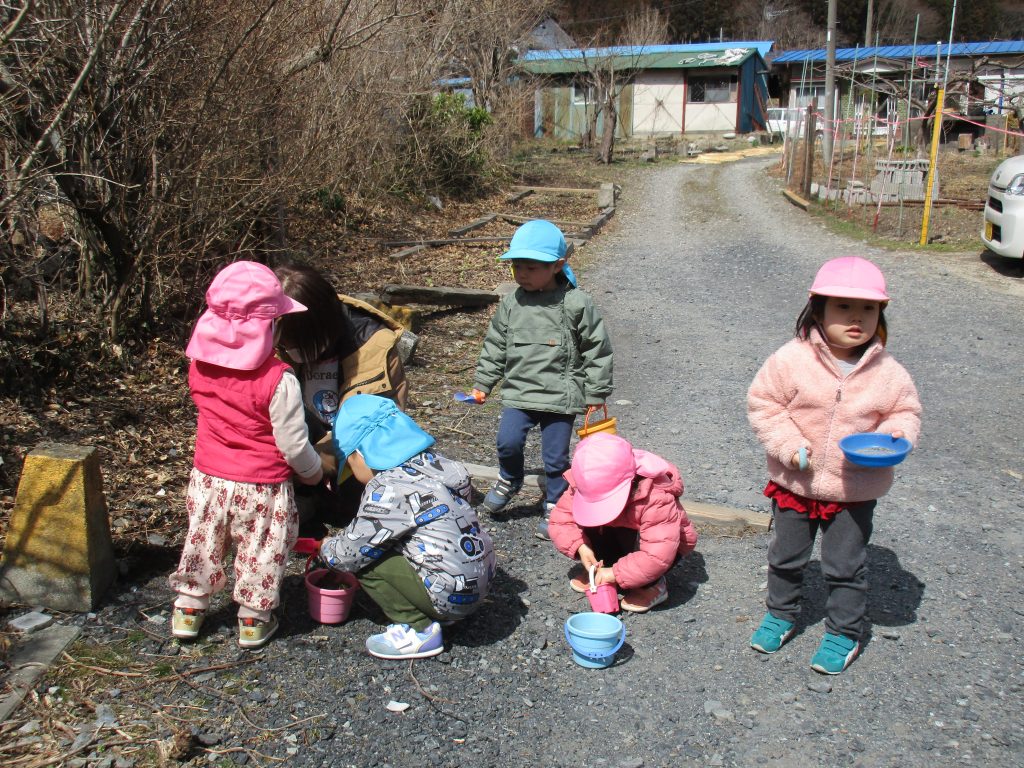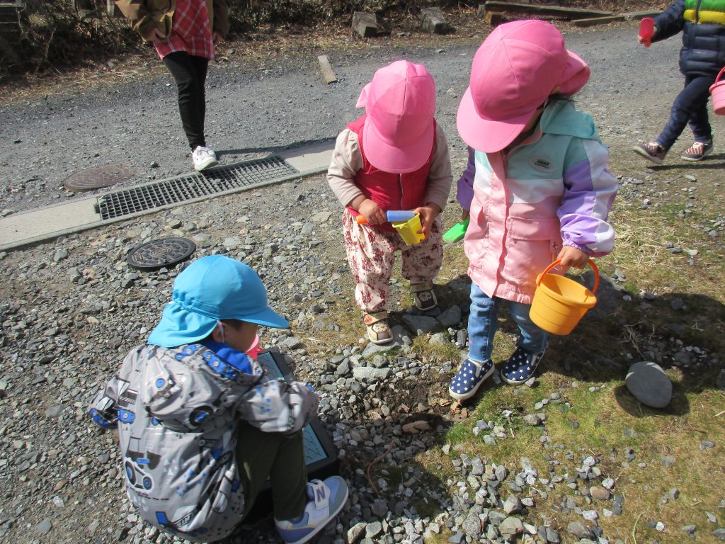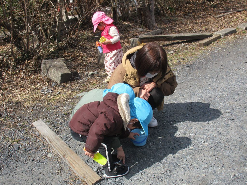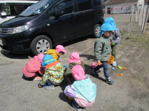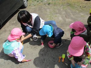 戸外遊びではバケツとシャベルを持って虫探しをしたり、