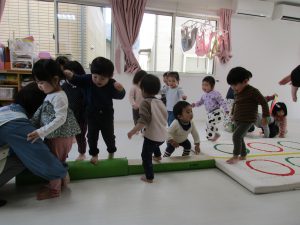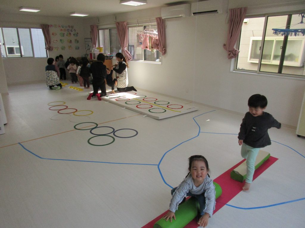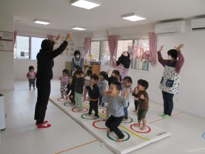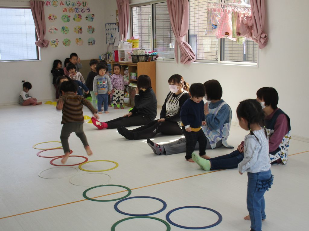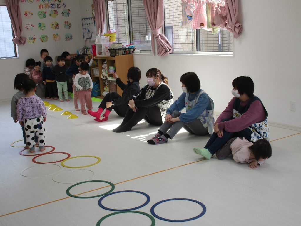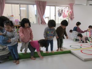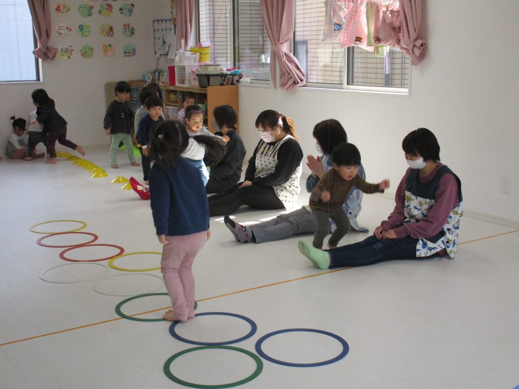 並んだ輪っかを「グーグーパー」でジャンプしながら進みました!!