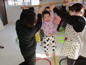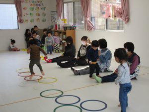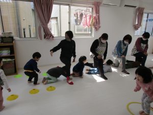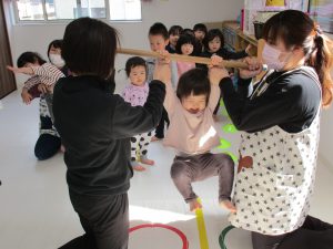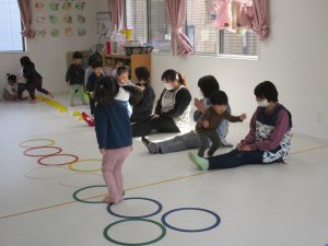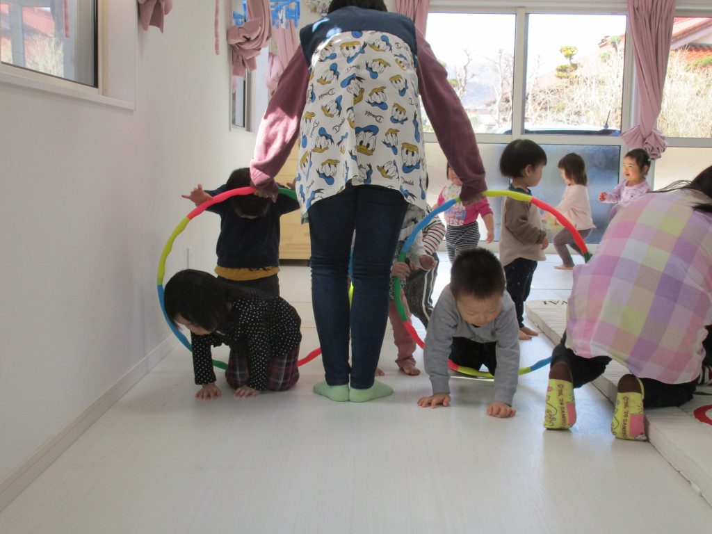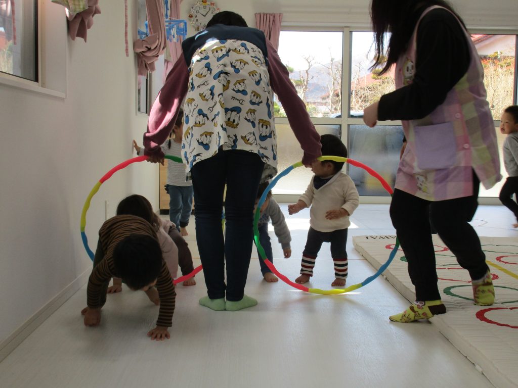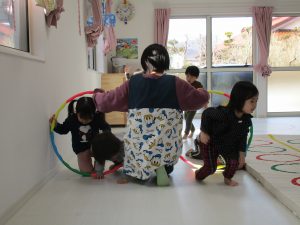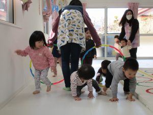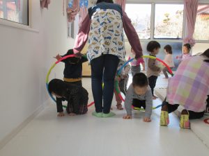 音楽に合わせて体を動かしたり、フラフープのトンネルをくぐったり、
