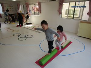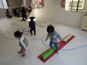 平均台やニョロニョロ動く紐を飛び越えて何度も繰り返し頑張りました(^o^)