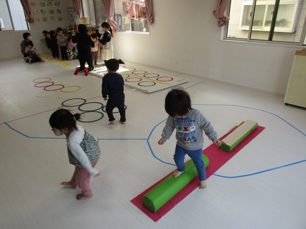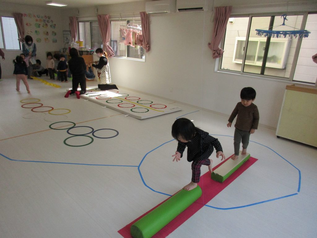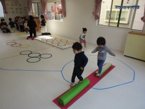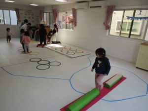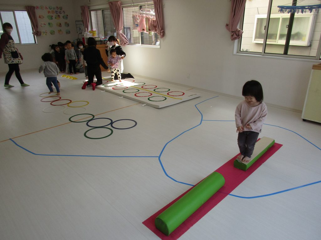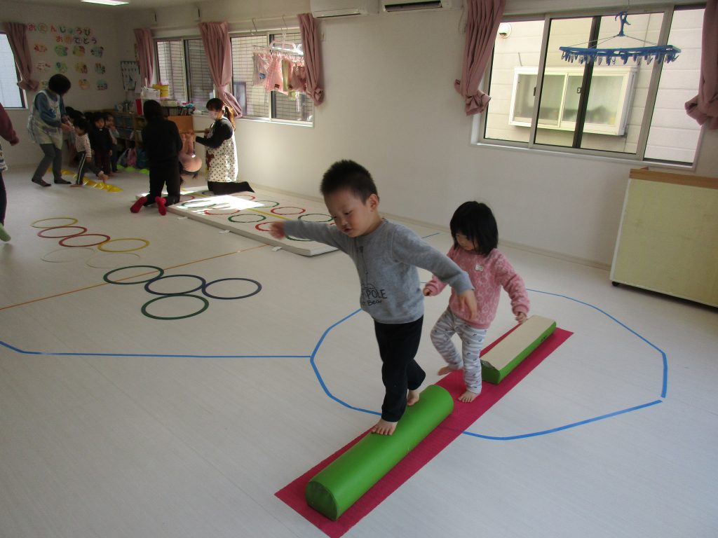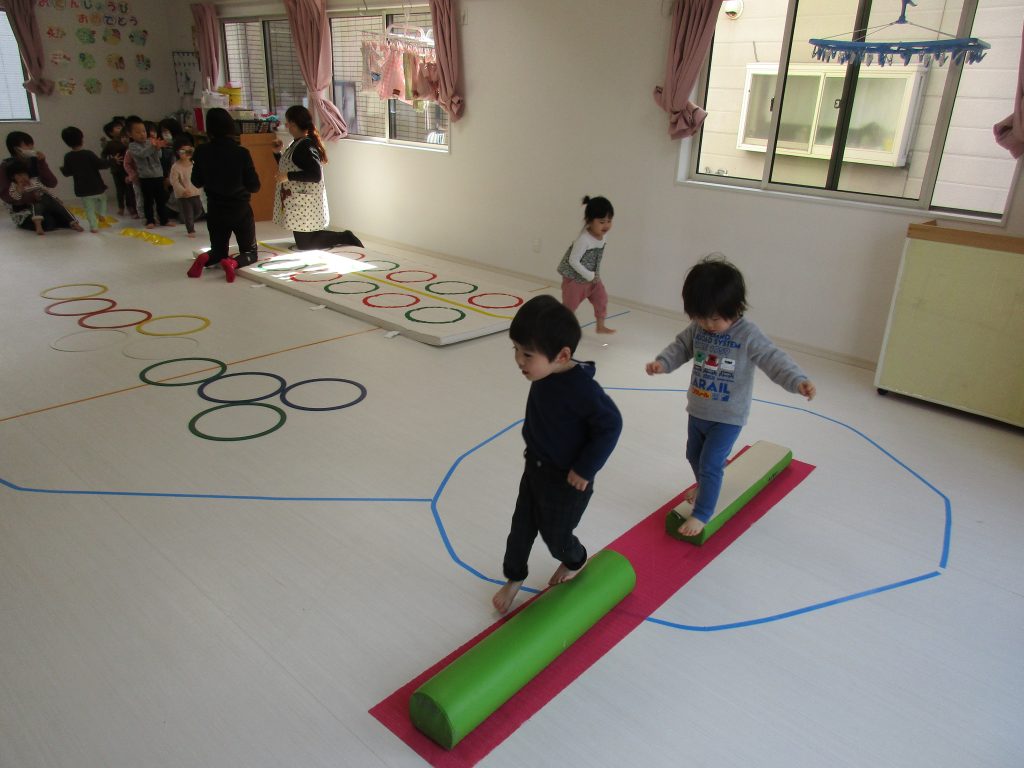 でんぐり返し・ぶら下がりの後は平均台を渡ったり、