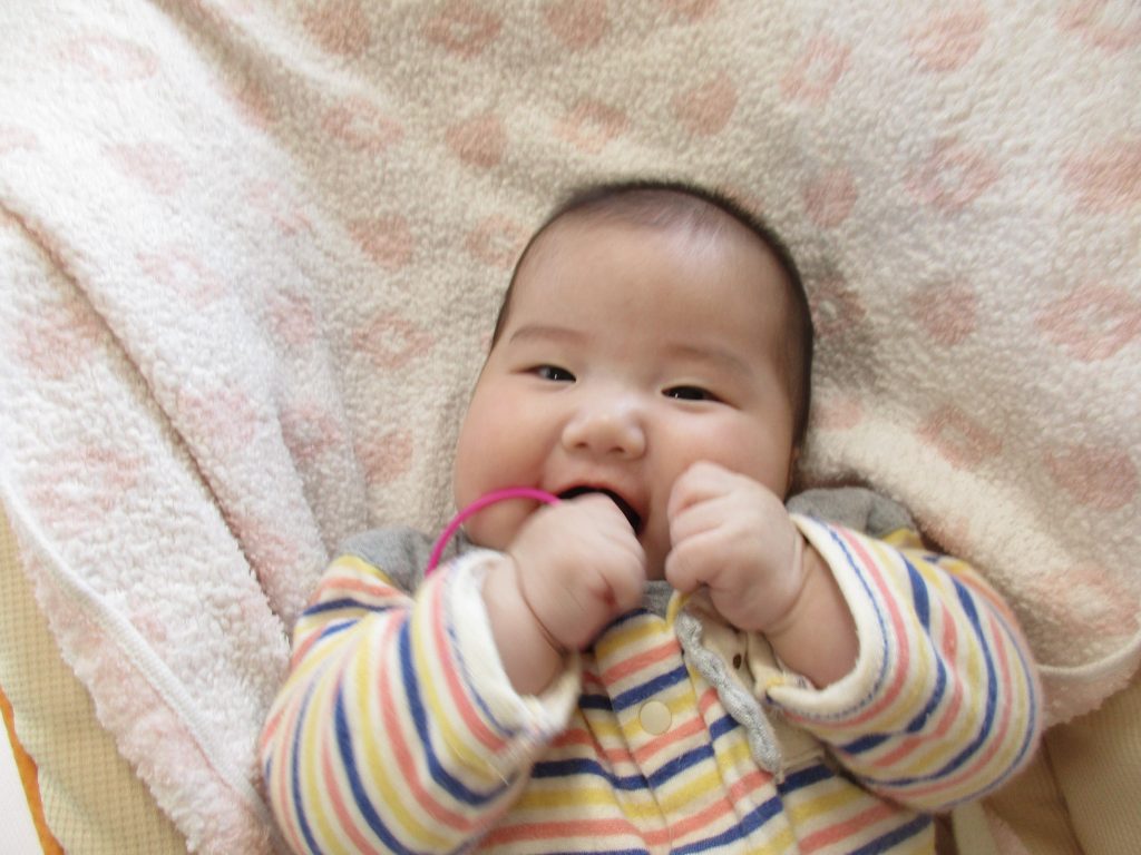 手に再び握らせてあげると笑顔を見せて遊んでいます❤(ӦvӦ。)