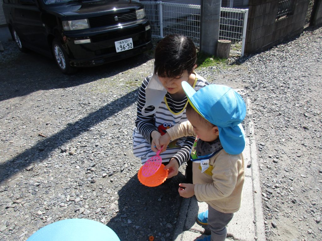 保育士と一緒にシャボン玉を飛ばすと初めは上手く出来ずにいましたが