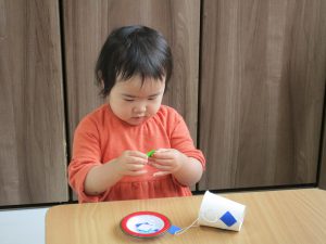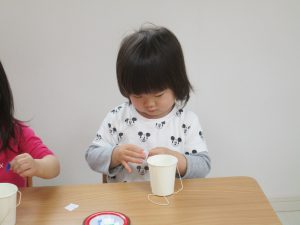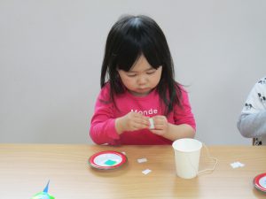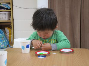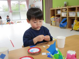 紙コップを使った製作で、大きい紙コップには青色系の折り紙、