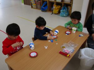 小さい紙コップには赤色系の折り紙を貼りました!!
