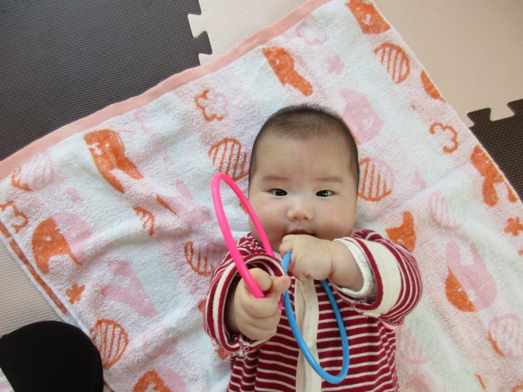 月齢の小さいお友達は輪っかの玩具がお気に入りで、にぎにぎして