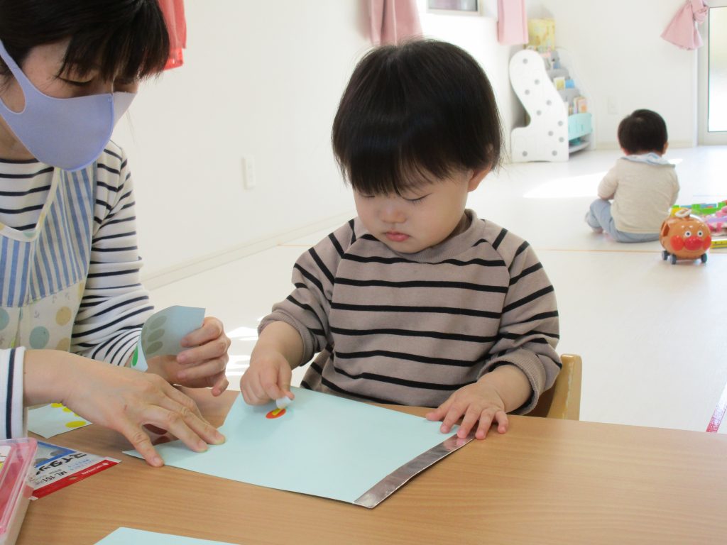 こいのぼり製作ではシールを貼ってウロコと目を付けました🎏