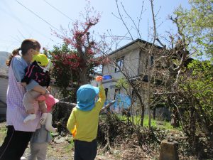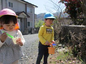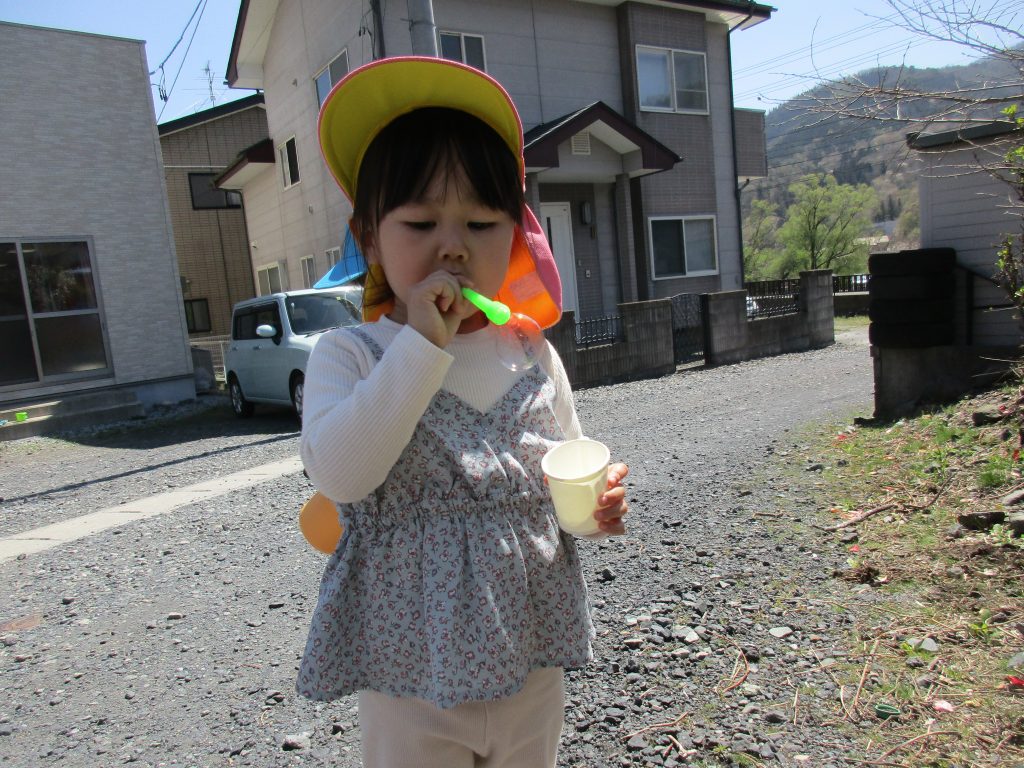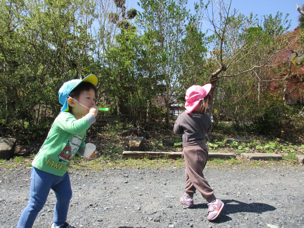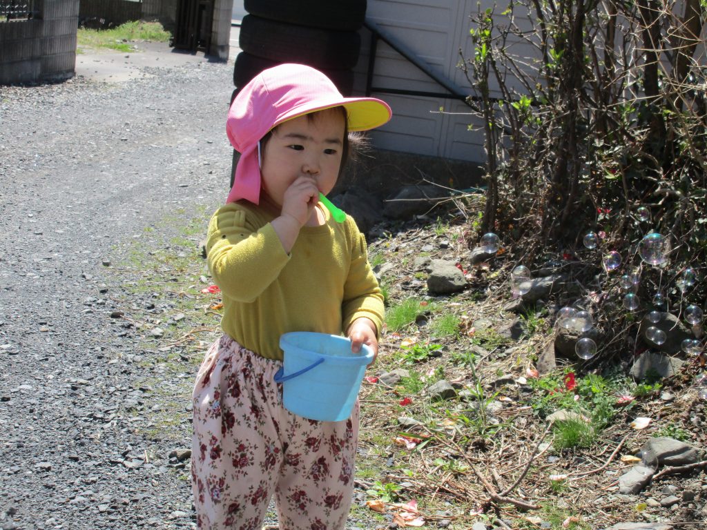 2歳児さんは一足先に園庭に出てシャボン玉をしたり、