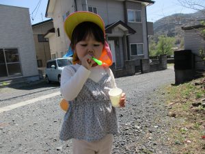 シャボン玉は上手に膨らませて、飛んでいくと嬉しそうに眺めては