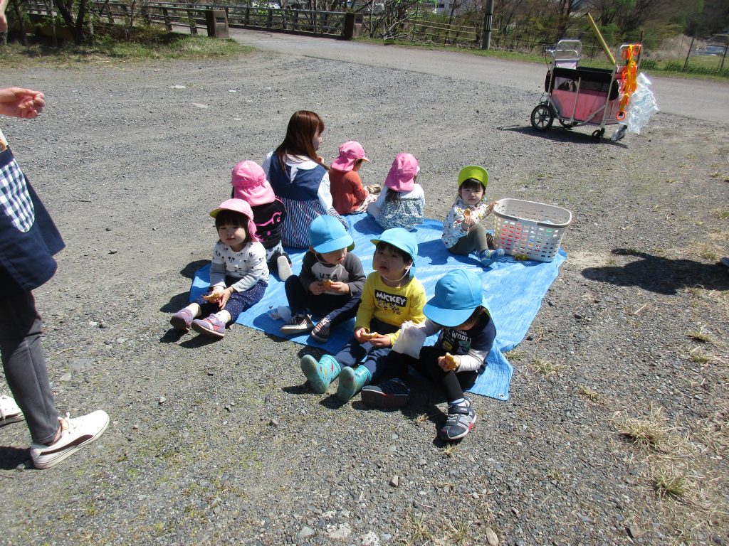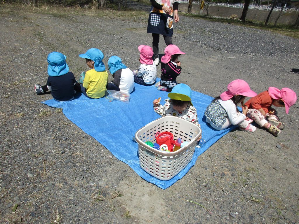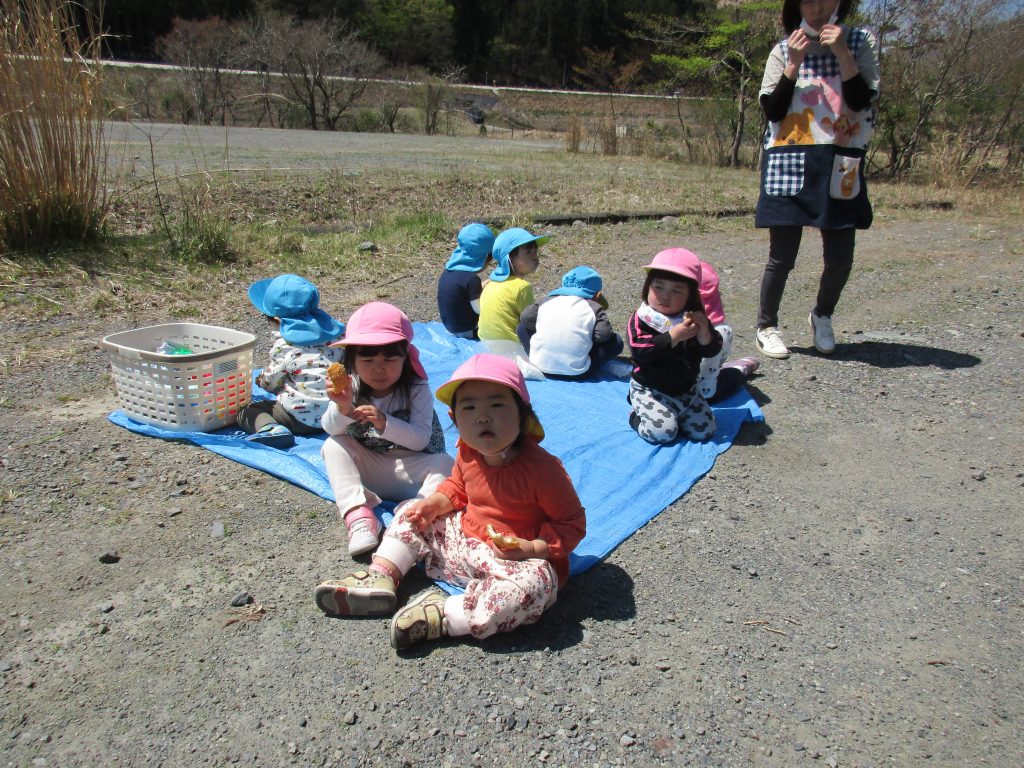 1・2歳児さんはおやつを持って行き、広場に着いたらまずは