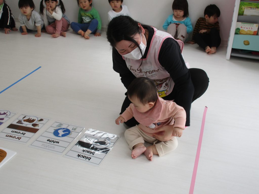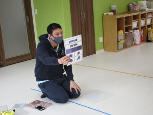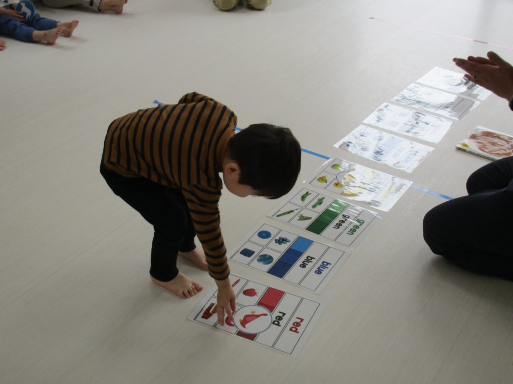 8色の色、それぞれのカードを見ながら日本語で色を答え、