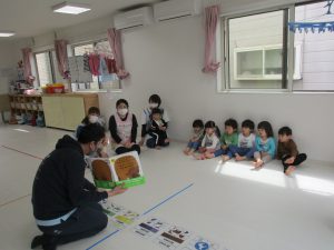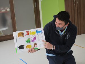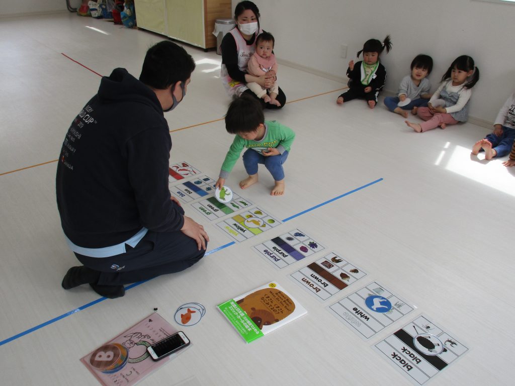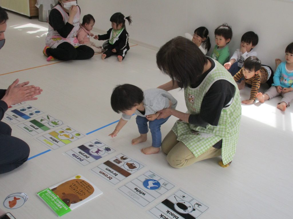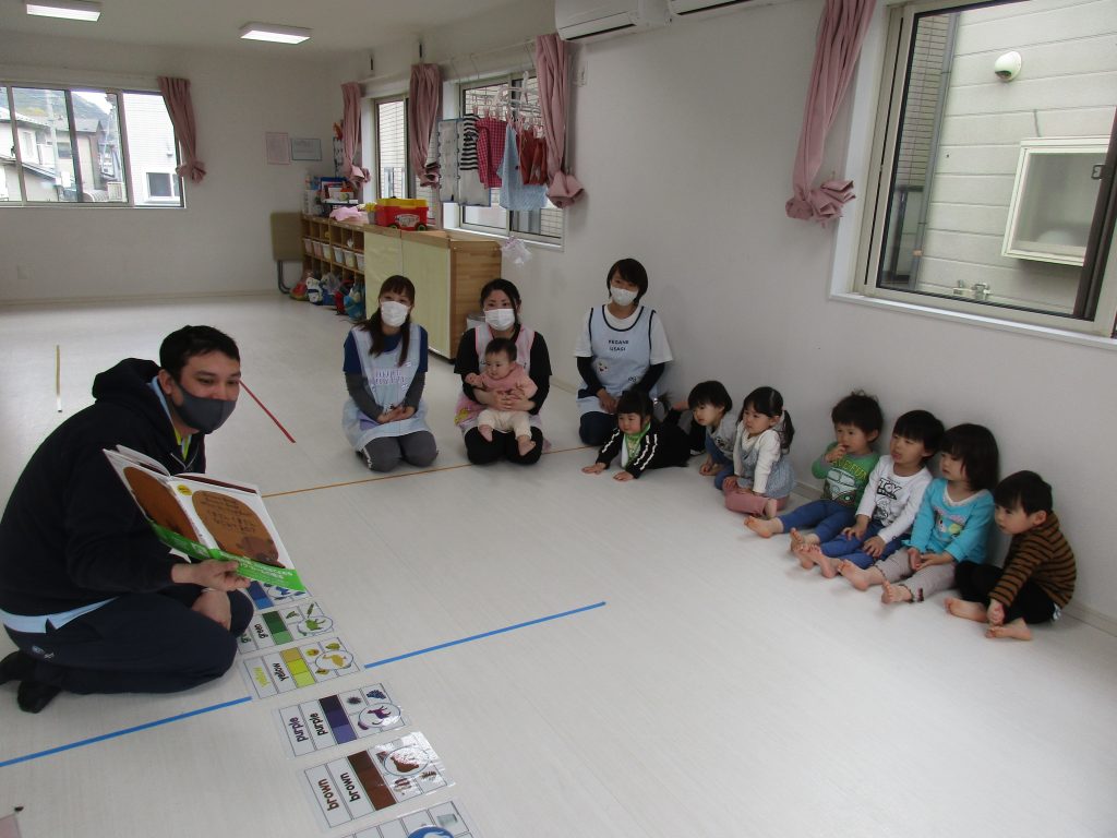 日本語で読んだ後、英語で読んでくれて、子ども達は興味津々で