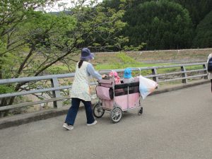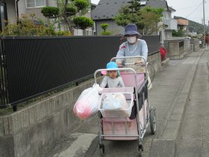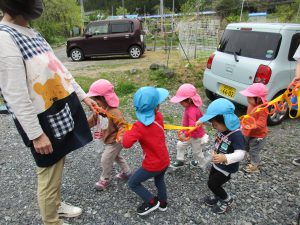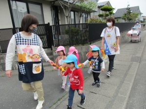 2歳児さんは誘導ロープに捕まって歩き、1歳児さんはお散歩カーに乗って