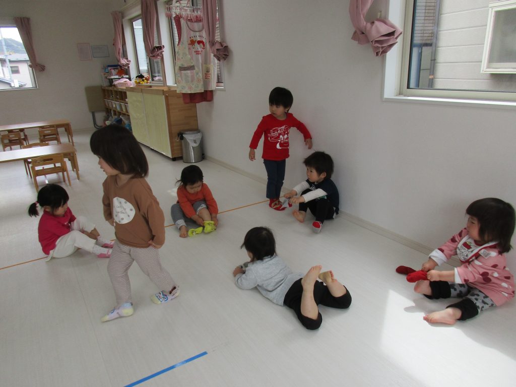 お散歩に出掛けるために靴下を履いて身支度をしている子ども達です!!