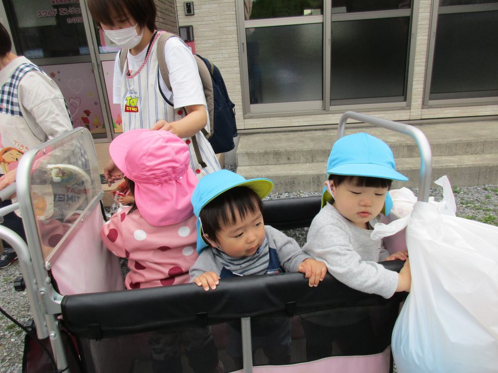 2歳児さんは誘導ロープに捕まって歩き、1歳児さんはお散歩カーに乗って